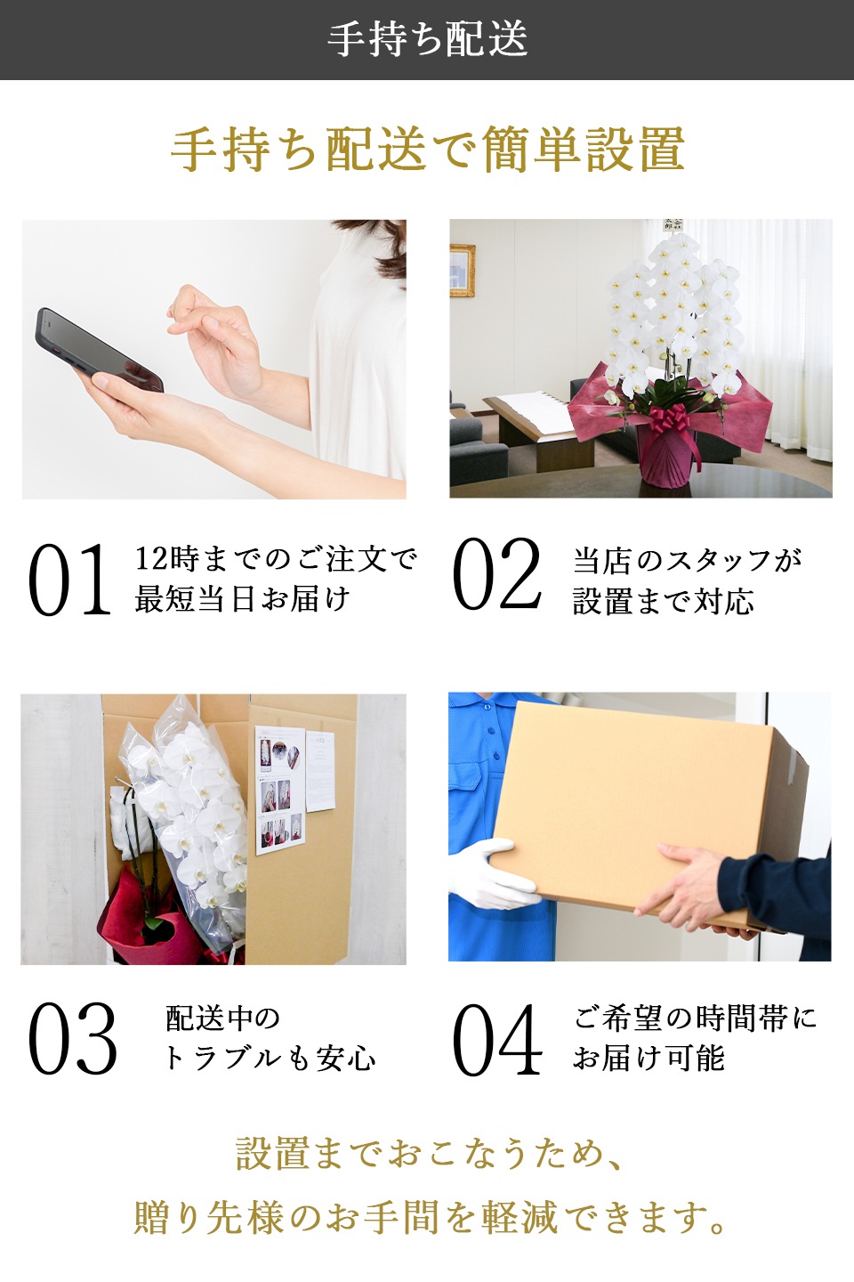 プレミアム胡蝶蘭3本立5Lホワイトは、掌からはみ出す花弁、子供の背丈ほどもある花列が圧倒的な存在感を放ちます。