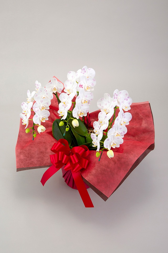 日本の四季折々の美しさを描いたワンランク上の胡蝶蘭うららかな春の日に舞い散る桜をミディ胡蝶蘭にあしらいました。お手頃なサイズ感ながらも、特別な装いをまとったミディ化粧蘭は皆さんの特別な日を、より印象的で大切な思い出にします。