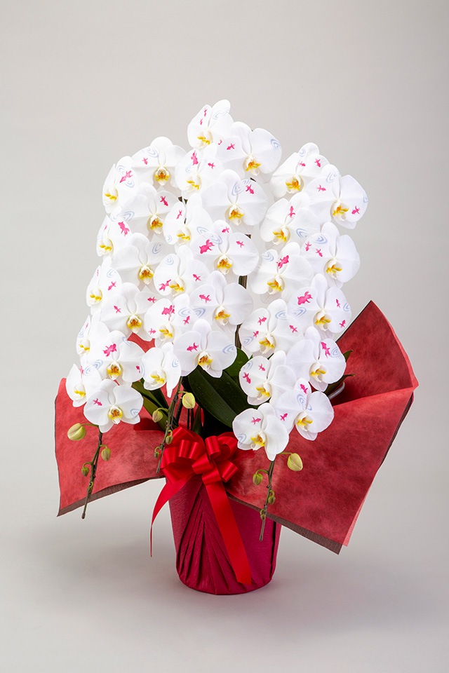 日本の四季折々の美しさを描いたワンランク上の胡蝶蘭化粧蘭~四季シリーズ~【夏】では、涼やかな金魚たち、その動きに合わせてふんわりとゆれる水面を表現しました。